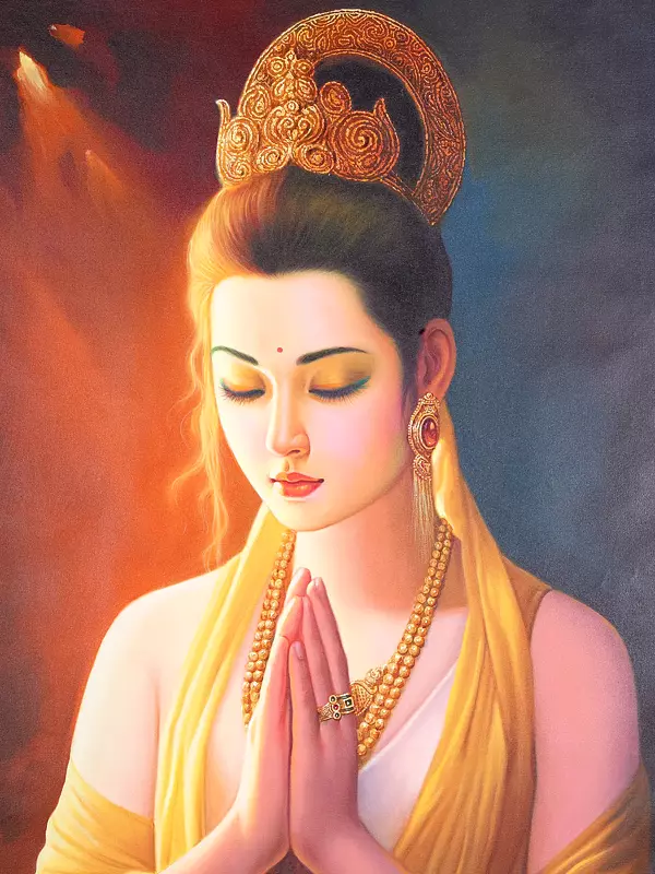 Bathed in a soft, ethereal light, this oil painting captures a moment of profound peace and inner reflection. The subject, adorned in golden hues and intricate jewelry, exudes a quiet strength and unwavering devotion.