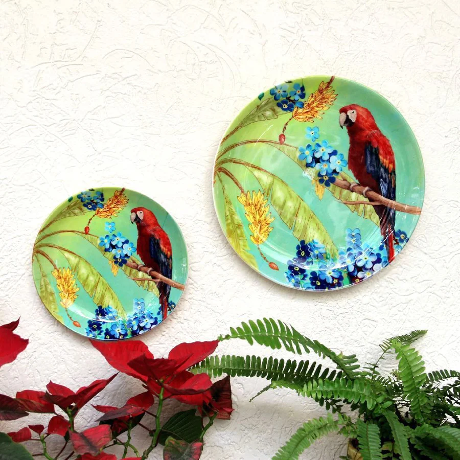 • Colourful display: The bright red macaw sitting on a twine pops out against the blue and green of the tropical backdrop on this ceramic decorative wall plate. This lush design will add a punch of colour to a room. Combine it with our other floral wall plates to make a unique display.